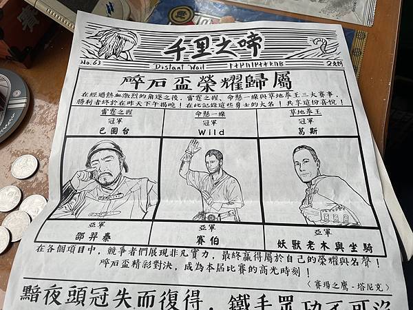 到圖書室接任務,找歐夫尼爾,但找到人時他正好要參加塔高法庭。後來回去圖書室時,圖書室館員說他來過了,但沒說是因為我們而來的,所以任務不算。後來又多接了幫忙買女神餅乾和換印章的任務,拿到了圖書館的信物,朋友進一步拿到了借閱證。印章很好看,很想花個二克朗自己蓋明信片,但當下最好看的印章不在而做罷,後來在翡翠綠葉也有看到印章,不曉得是不是就是他們所指的印章?可惜羅菲亞不在,不能問他。在大顆龍蛋酒館時,學會了北歐的棋盤遊戲,說實話,玩白棋好難贏啊!買了龍林野味切盤,好吃!麥茶是免費的,而且可以借用酒店的杯子好方便!自來水則是冒險大帳後面自己加,不愁沒水喝。目睹了碎石賽的雷霆之握和草地拳王。雷霆之握是比腕力,還可以用入眠草好酷wwwww 旁邊直接開賭盤www 最後恭喜巴圖台!草地拳王大家打得好有創意!記得是葛斯直接把喬安整個舉起來?超強!四肢著地的野獸攻擊也讓人印象深刻,冠軍實至名歸!命懸一線後來看影片是站在木樁上拔河,不容易啊~